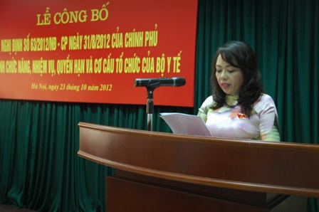 Ngày 23/10/2012, Bộ Y tế đă long trọng tổ chức lễ công bố Nghị định số 63/2012/NĐ-CP ngày 31/8/2012 của Chính phủ quy định chức năng, nhiệm vụ, quyền hạn và cơ cấu tổ chức của Bộ Y tế. Phát biểu tại buổi lễ công bố PGS.TS. Nguyễn Thị Kim Tiến – Bộ trưởng ...